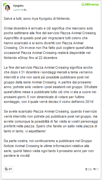 Tramite Miiverse (e in particolare grazie all’utente Kyogoku che si occupa della serie Animal Crossing) siamo venuti a sapere che presto la Piazza Animal Crossing sospenderà il servizio, virtualmente per sempre.