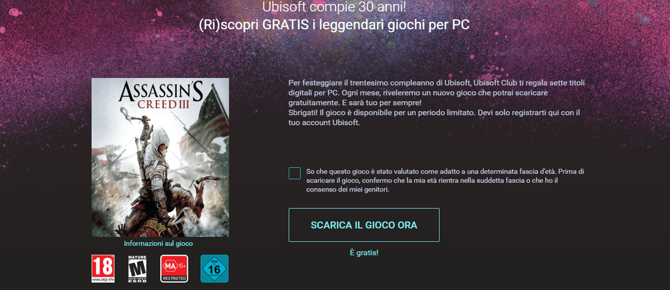 Scaricare il gioco è facile: se disponete di un account Uplay e del programma corrispondente per PC (che in caso contrario potete scaricare qui), visitate la pagina UBI30, confermate la vostra età aggiungendo la spunta e fate click su “Scarica il gioco ora”. In questo modo Assassin’s Creed III sarà vostro per sempre.