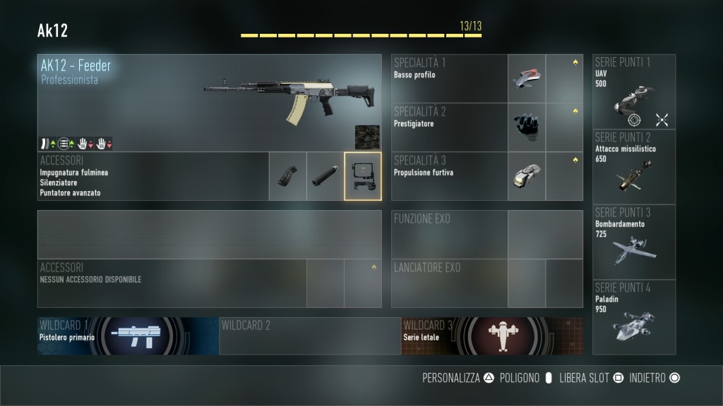 Avrete sicuramente notato, a questo punto, che ho deciso di risparmiare per quanto riguarda abilità e lanciatore EXO. Questo perchè le granate mi sono sembrate fin da subito veramente poco efficaci in quanto facilmente schivabili e poco dannose. Per quanto riguarda invece le funzioni EXO, non ne ho trovate di particolarmente entusiasmanti e in grado di apportare un vantaggio evidente, per cui ho deciso di concentrare i punti rimanenti su una scorestreak davvero devastante che, grazie alla wildcard “Serie Letale“, conta ben 4 elementi: