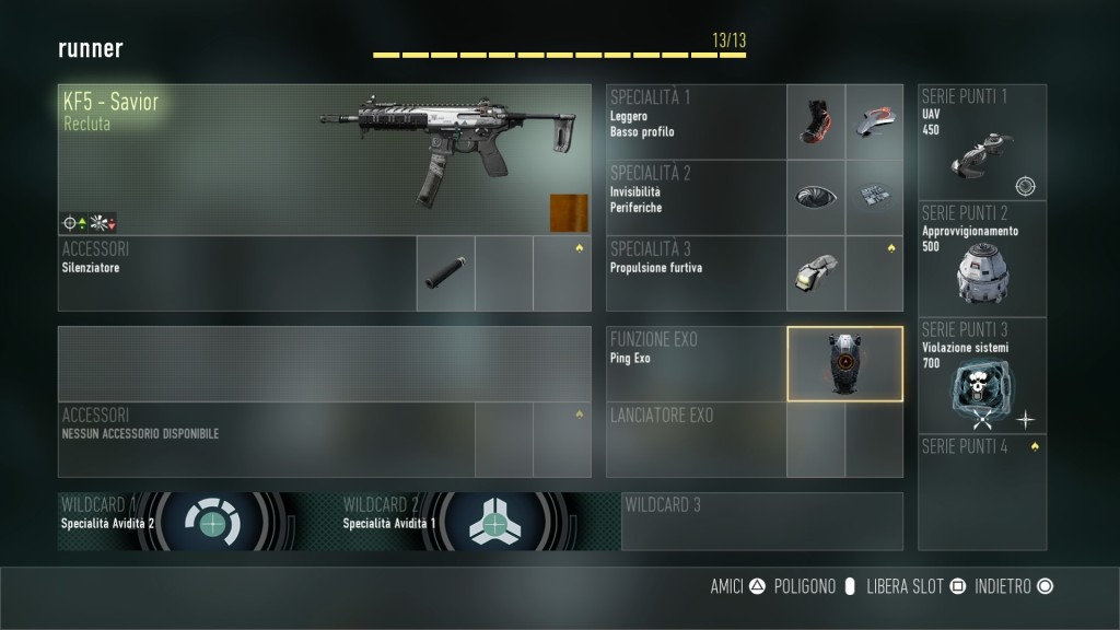 Ancora una volta ho deciso di eliminare le granate, troppo deboli e troppo rumorose per il nostro stile di gioco. Ho però pensato di impiegare un abilità EXO, ossia il Ping EXO, che vi permette di visualizzare, per un breve periodo di tempo, i movimenti EXO dei nemici nonchè la posizione di coloro che stanno facendo fuoco. Ottimo qualora il vostro team non abbia uno UAV attivo e voi siate circondati da nemici. Passiamo infine alla scorestreak: