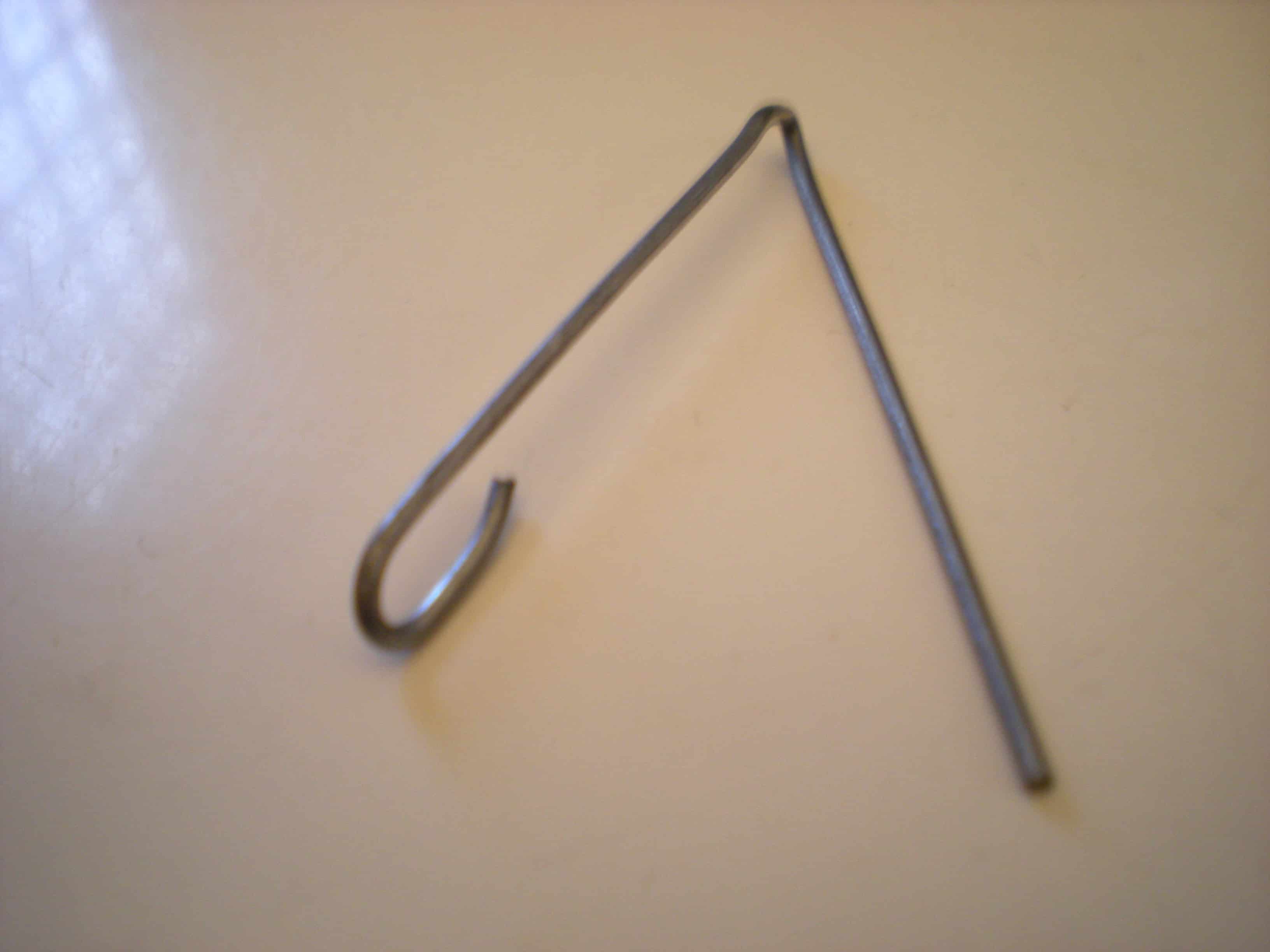 - Manipolate la graffetta (o il filo di ferro) fino a distenderla parzialmente e rivestitela di nastro isolante. Questo passaggio è facoltativo ma consigliato per i più prudenti o avveduti. Dopodiché modellatela con una pinza fino a darle una forma simile a quella mostrata nell’immagine. Assicuratevi di modellare la curva superiore attorno alla vite che utilizzerete per fissare il supporto, in modo che stringendola questa vada a esercitare pressione sul filo di ferro, mantenedolo fermo in posizione. Non è un procedimento irreversibile, a patto di agire con cautela sula filo di ferro, e potrete intervenire in seguito per regolare la tensione e la forma del fermo.