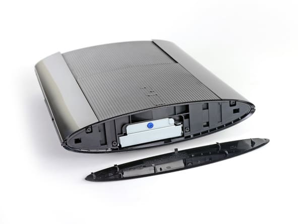 - Scollegate il cavo di alimentazione. Individuate la parte superiore della console (è quella senza il logo Playstation, sul lato del lettore) e fate scorrere il pannello, applicando sullo stesso una delicata pressione in direzione del retro della console. In questo modo si scopre lo slot di alloggiamento del disco fisso.