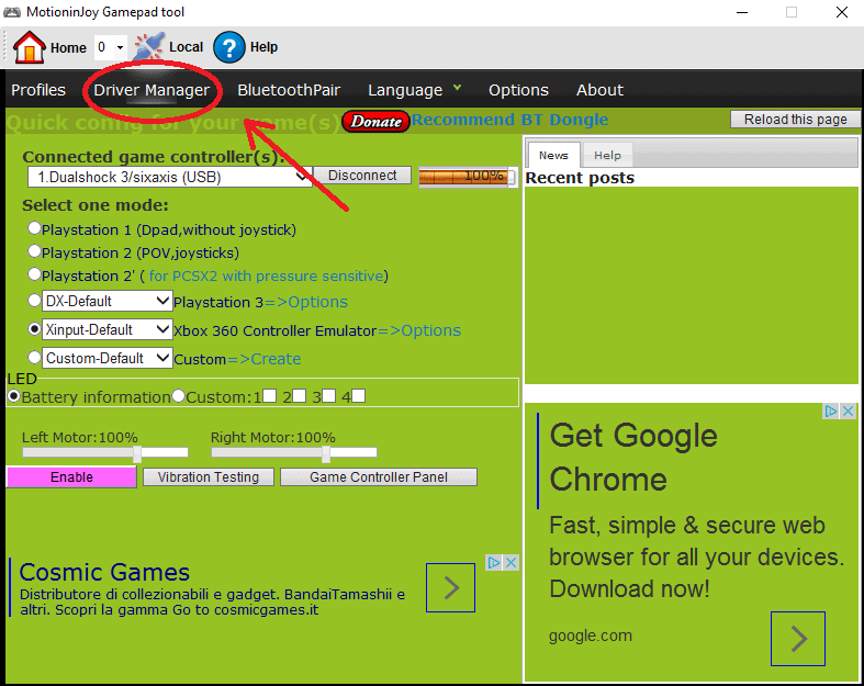 Ebbene no, altrimenti non ci sarebbe bisogno di una guida! Una volta installato il programma, infatti, dovrete caricare i driver del dispositivo di vostro interesse, il controller PS3. Recatevi dunque alla voce Driver Manager del menù in alto.