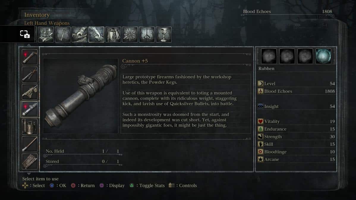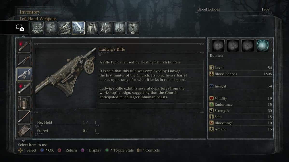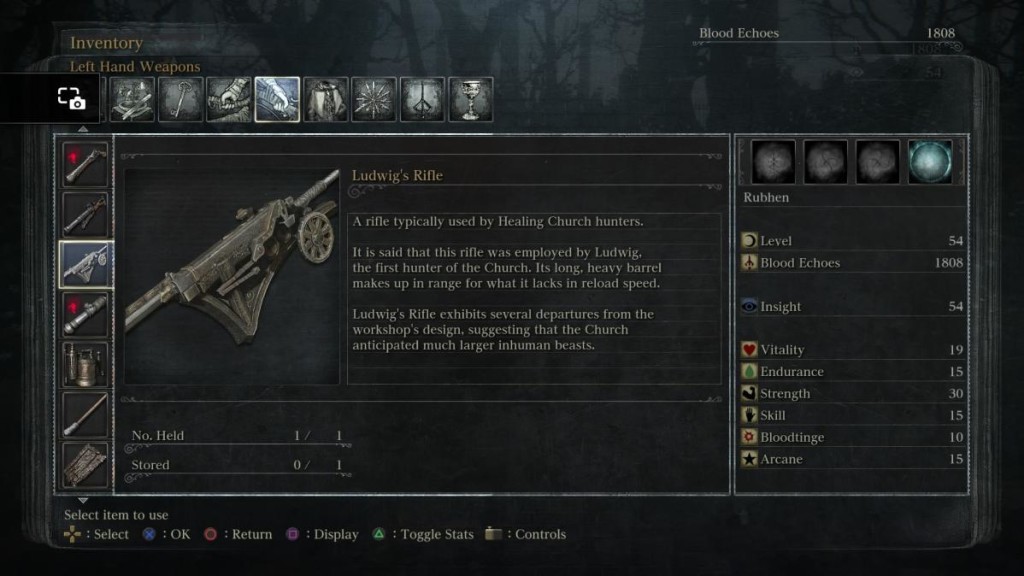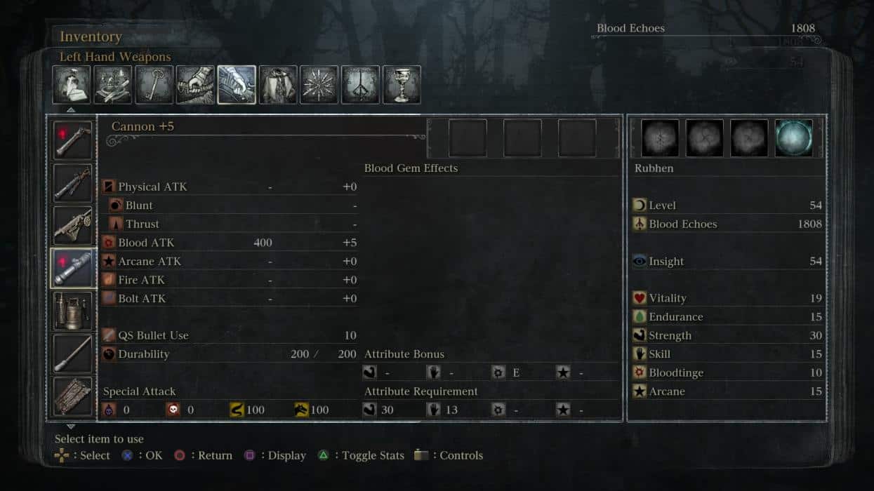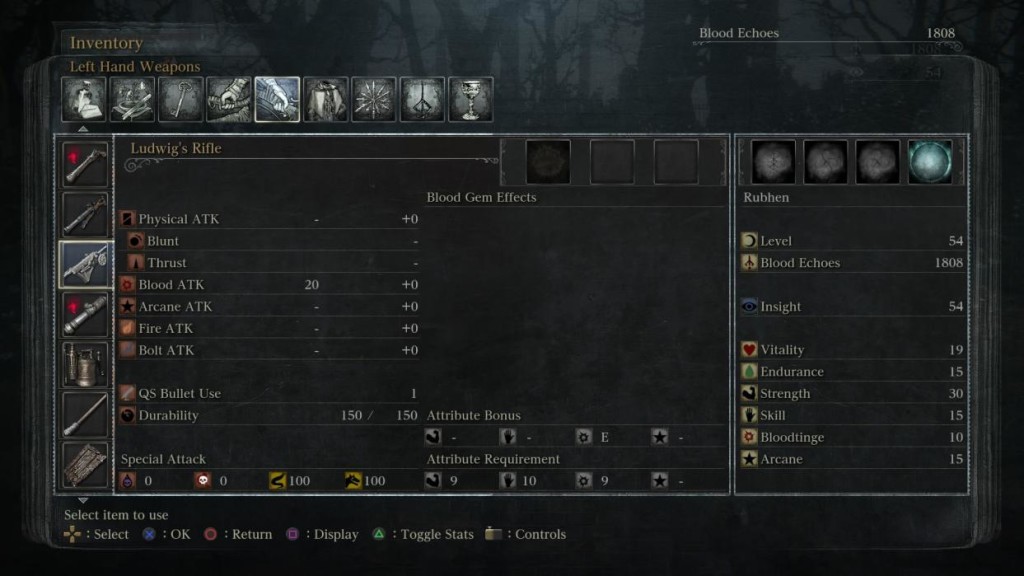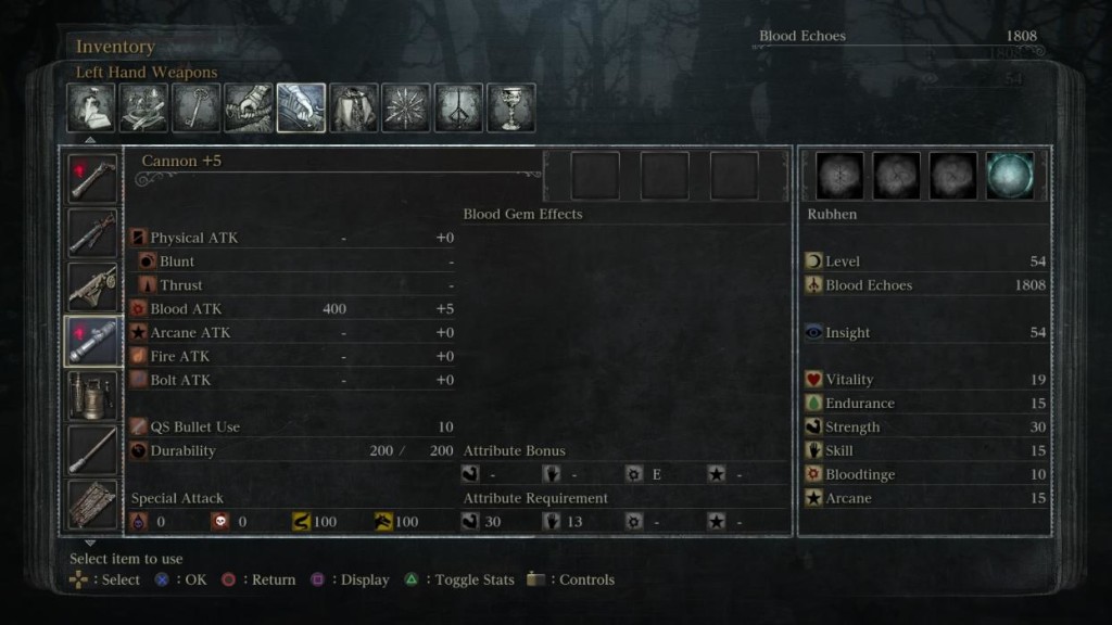 Qui si entra più nei dettagli. Come si vede dal menu ora tutti gli oggetti impugnabili sono semplicemente divisi in “mano destra” e “mano sinistra” – e a sinistra non ci sono solo bocche da fuoco tradizionali (l’oggetto sotto a quello selezionato sembra il lanciafiamme che si era visto in alcuni trailer, e in fondo c’è uno scudo di legno). I danni possono essere di diverse tipolgie: Fisico (con specificazione per Impatto e Penetrazione), Sangue, Arcano, Fuoco e quello che deduco sia Fulmine. Restano bonus e requisiti delle caratteristiche base, e sembra che ogni arma possa causare danno extra contro tipi molto specifici di nemici.
