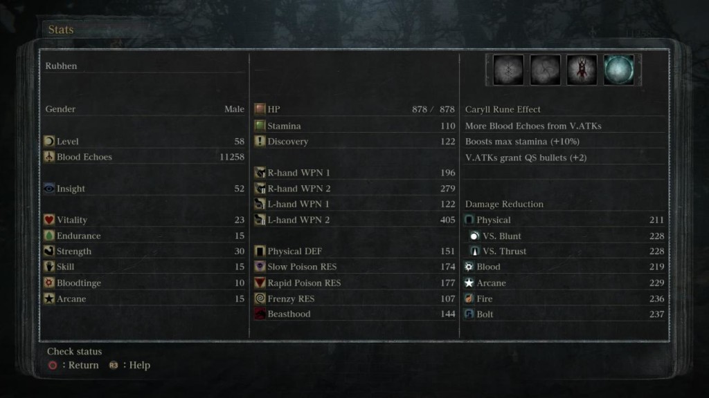 Il profilo completo del personaggio. Le statistiche “primarie” si sono ridotte rispetto ai vecchi titoli di From Software, ma compaiono alcune voci abbastanza misteriose, come “intuizione” e “scoperta”.