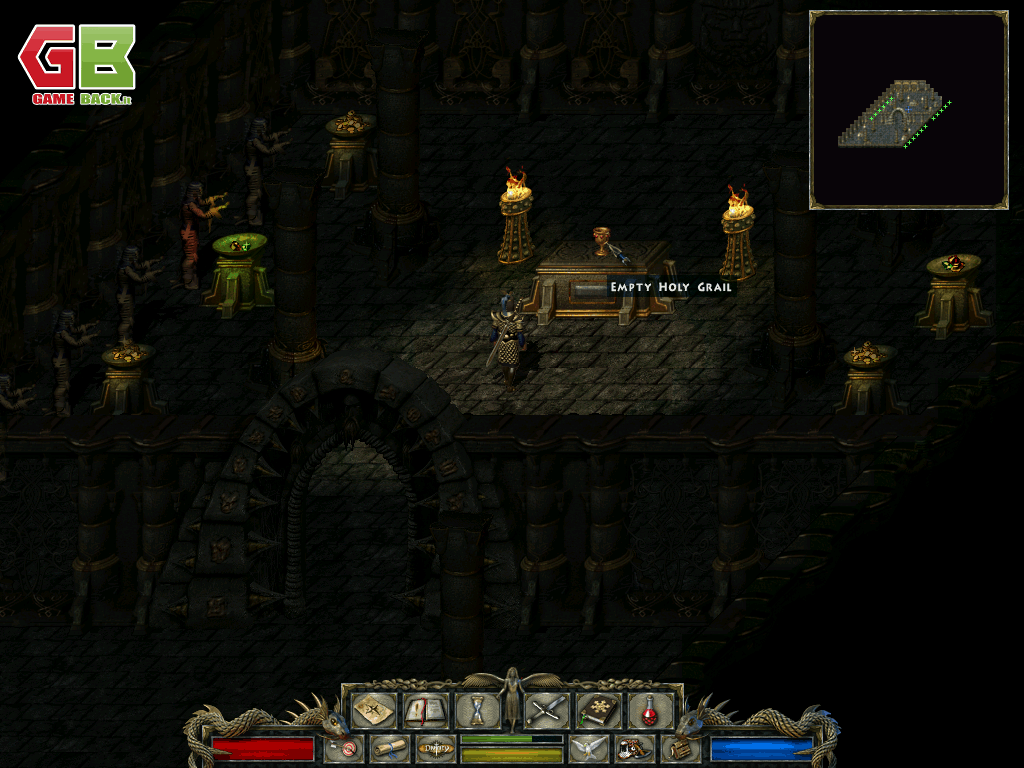 Per farla breve, una persona viene trasformata in animale da un mago, e dovete scoprire la cura. Un sacerdote vi dice che l’acqua di una qualche fonte sacra a cui solo lui ha accesso potrebbe funzionare, ma l’unico contenitore in grado di trasportarla è il Graal. Quindi costeggiate per cinque minuti delle montagne finché non trovate una grotta, fate fuori uno scheletro di fuoco, entrate in un portale, raccogliete il calice e venite smembrati dalle mummie lì presenti, che si risvegliano. A questo punto caricate l’ultimo salvataggio – che furbamente avete realizzato prima di entrare nel portale -, piazzate una delle due piramidi del teletrasporto fuori da esso, entrate, raccogliete il Graal, mostrate il dito medio alle mummie mentre sparite dalla sala, andate dal sacerdote e usate l’acqua per invertire l’incantesimo e salvare quella che credo si rivela essere un’elfa (che dopo tutto questo casino vi dice “oh, grazie” e se ne va).