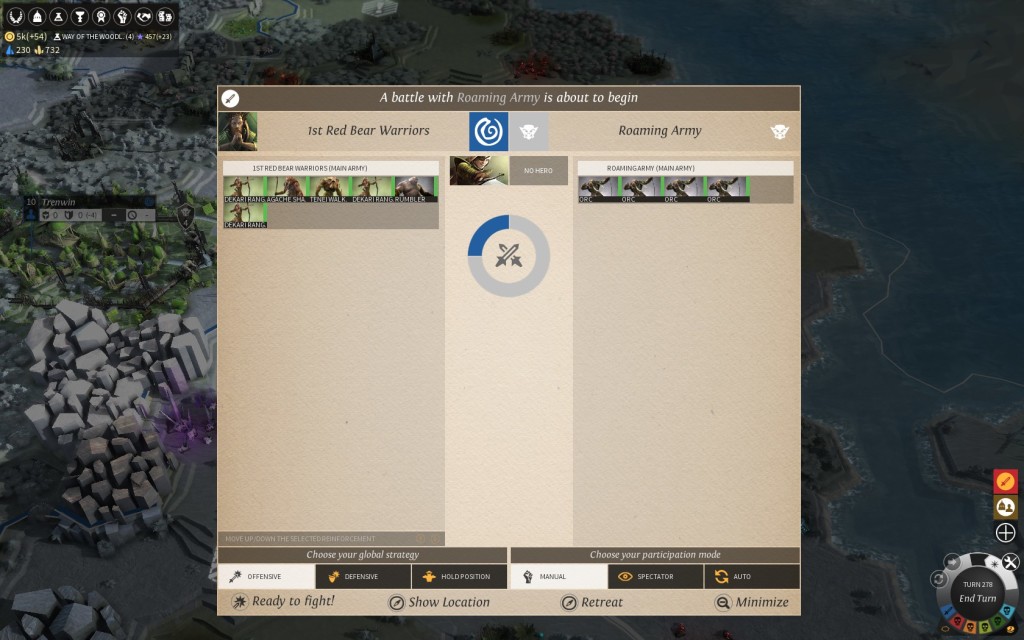 La principale incognita di Endless Legend è il sistema di combattimento, che ha le potenzialità per essere il fiore all’occhiello e forse addirittura il maggior punto di forza del gioco, ma che allo stesso tempo ha anche le premesse per rivelarsi il difetto più evidente del titolo di Amplitude Studio. Innanzitutto, prima di iniziare il combattimento sarà possibile scegliere se controllare manualmente le proprie truppe oppure lasciar gestire tutto alla CPU, opzione utile soprattutto quando si è in forte vantaggio sugli avversari e non si vuole perdere tempo inutile a combattere una battaglia già vinta in partenza.