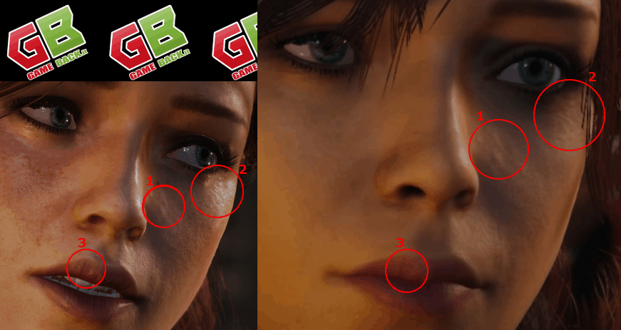Il lavoro sulle texture è simile, ma a sinistra si evidenzia un livello in più di colorazione della pelle diffuso sulle guance. Questa potrebbe essere qualcosa di carente nella versione PS4, o magari potrebbe non esserci in questa scena, con queste luci o in base a una miriade di altre circostanze. Qui potrebbe esserci qualcosa di diverso, ma è tutt’altro che confermato al 100%, visto che si tratta appunto di due scene diverse con due luci diverse.