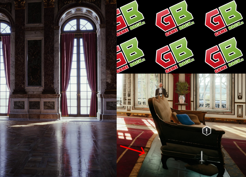 Se prima le due immagini erano paragonabili, qui ci sono già diverse discrepanze. Sì, sono due interni e ci sono delle finestre, ma non solo si tratta di due edifici diversi, sono due edifici dallo stile e dai colori completamente diversi: uno ha il pavimento in marmo lucidato e l’altro apparentemente in mattonelle; uno ha i muri adornati da bassorilievi, l’altro no; uno ha dei mobili, l’altro no. Questo senza contare che nella prima immagine le finestre sono viste molto più da vicino che nella seconda.