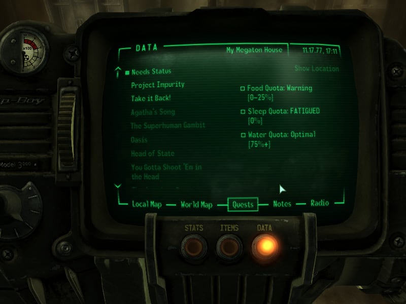 Se non volete esagerare nei cambiamenti, ma al contempo vi piacerebbe provare una mod che aggiunga un sistema dedicato ai bisogni in Fallout 3, potreste provare Simple Needs, la mod è poco invasiva e lascia l’ambiente di gioco totalmente invariato, l’unica cosa di cui vi dovrete preoccupare è di nutrire, abbeverare e far riposare il vostro giocatore. Con Simple Needs cercare di sopravvivere all’olocausto nucleare avrà un maggior senso.