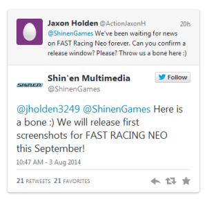 Shin’en ha fatto sapere tramite Twitter che il progetto Fast reacing Neo (seguito del titolo uscito su Wiiware) verrà mostrato a settembre: al centro dell’attenzione ci saranno in particolare alcuni screen, come dichiara la stessa Shin’en: