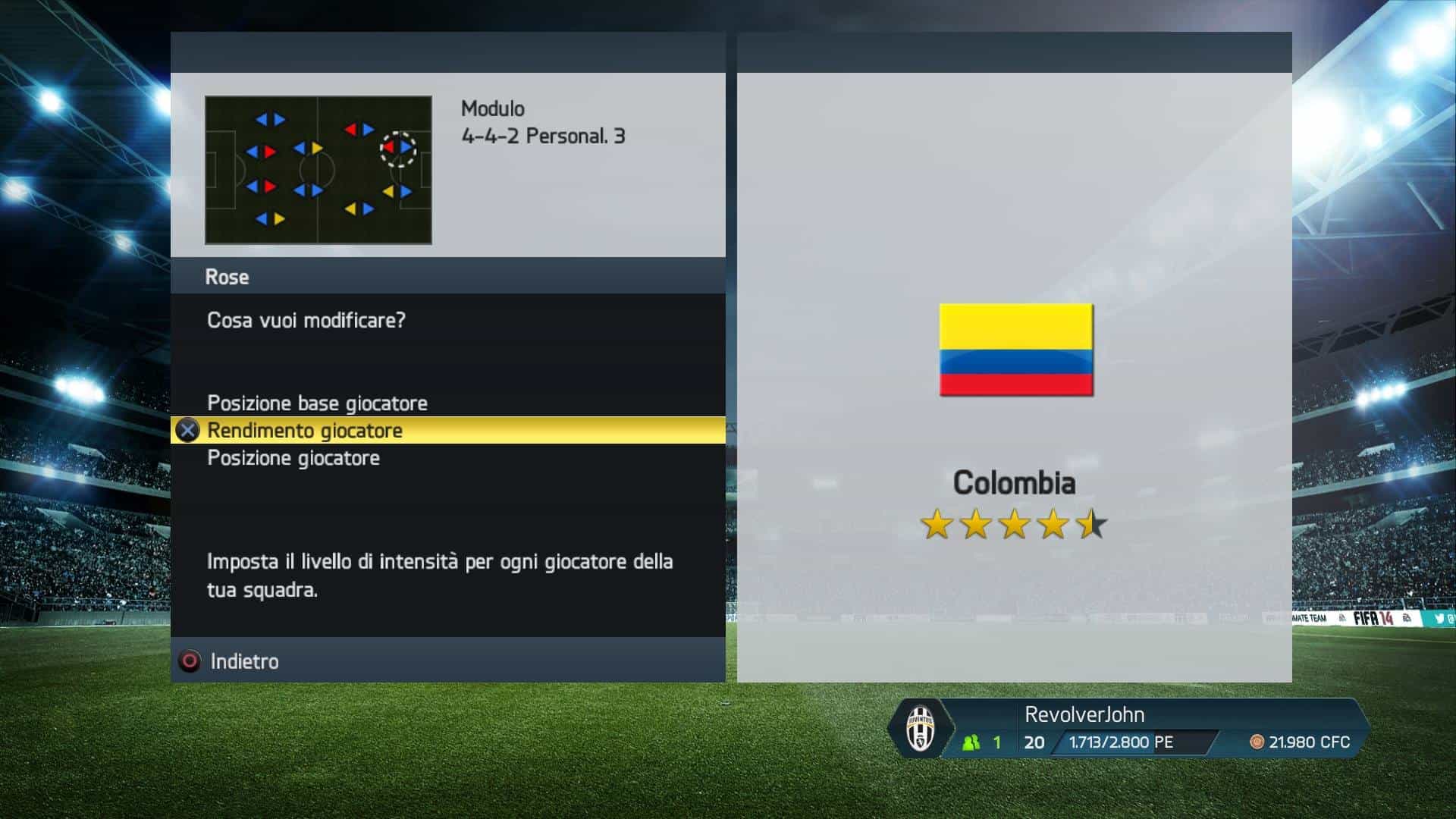 Visto che la Colombia ha il suo punto di forza sulle fasce e in attacco, il modulo più indicato mi è sembrato il 4-2-2-2, che mi permette di schierare due terzini, due ali e due attaccanti. La scelta migliore, vista la rosa a disposizione. Non ho modificato le posizioni dei giocatori, visto che non ce n’era bisogno, tuttavia, come sempre, sono andato a ritoccare l’intensità dei giocatori in attacco e in difesa e ho dato qualche indicazioni riguardante i movimenti dei giocatori durante la fase offensiva e difensiva.