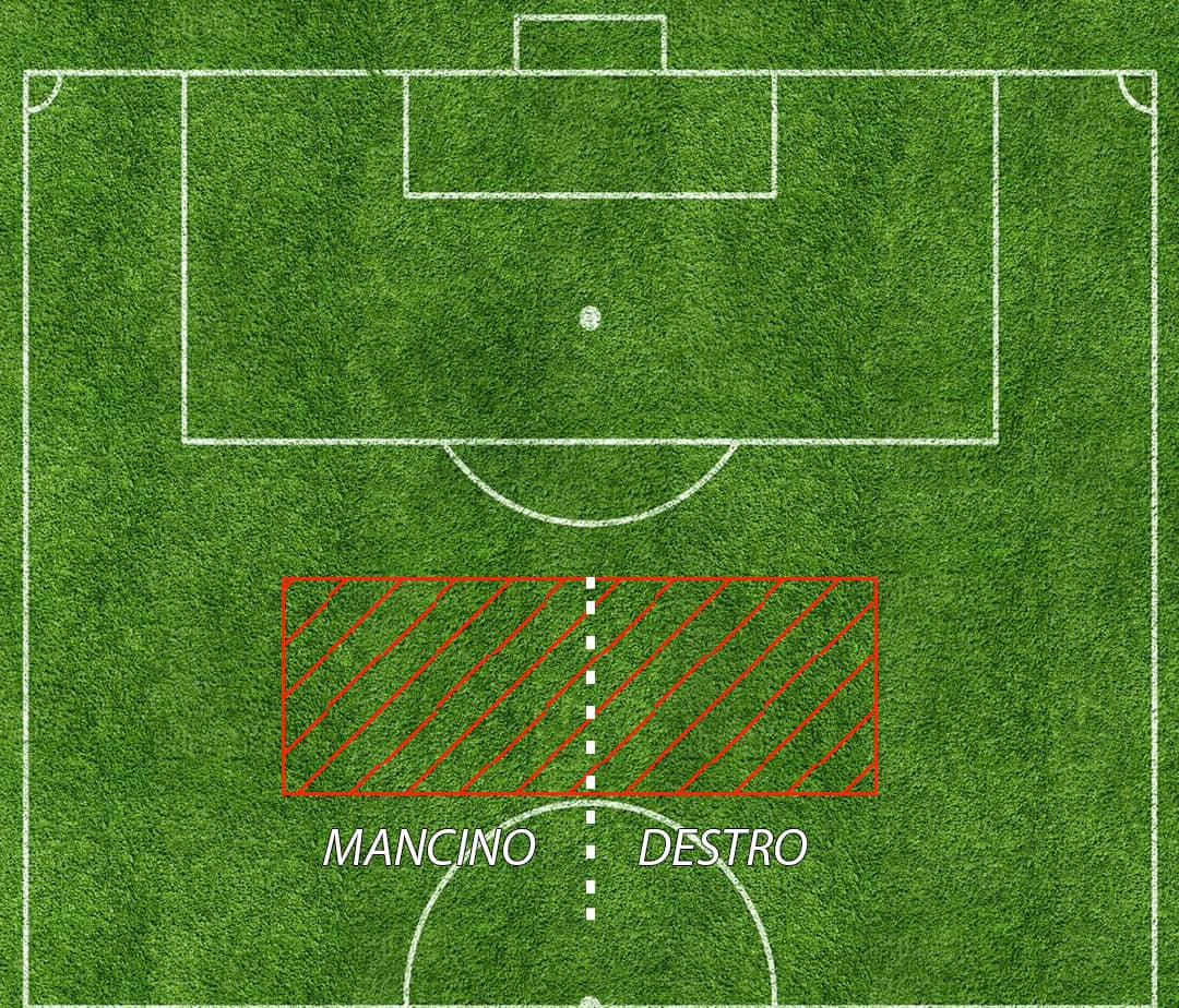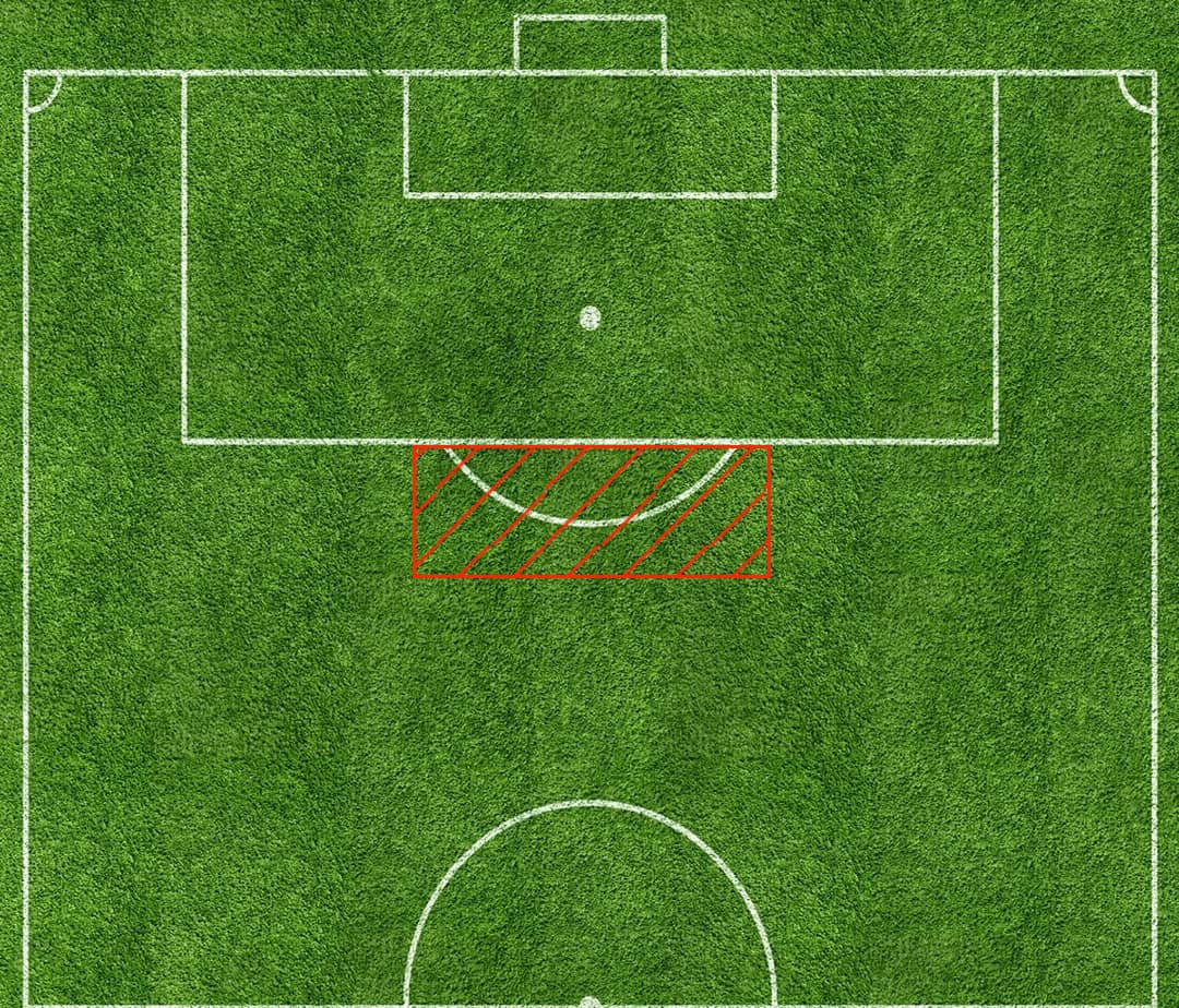 Innanzi tutto, definiamo cosa si intende per punizioni da zona centrale (da vicino): per essere il più chiaro possibile e non dilungarmi in giri di parole, inserisco qui sotto un’immagine. I calci piazzati nella zona sbarrata di rossa sono quelli che andremo ad esaminare in questo paragrafo.