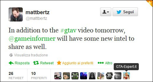 Tramite un tweet, Gameinformer ha annunciato che domani svelerà nuove info su GTA V che accompagneranno il debutto del trailer. Qui di sotto l’immagine del tweet.