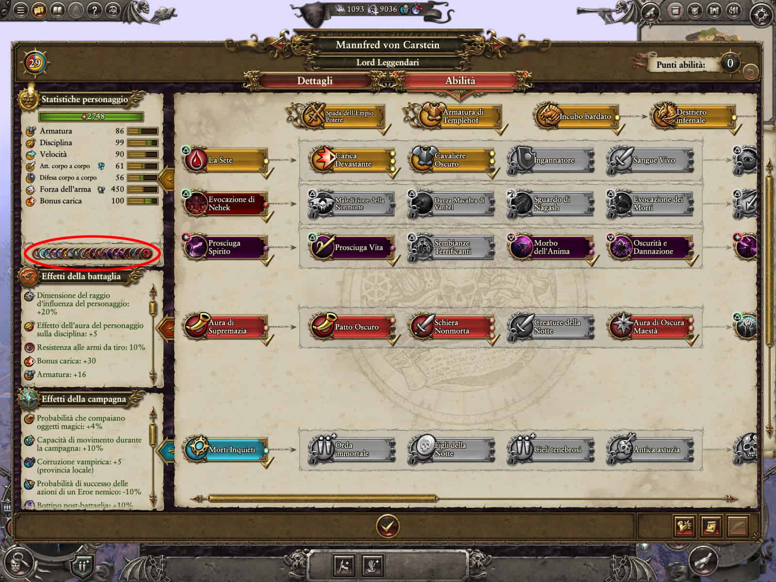 Il pannello delle abilità. Sulla sinistra sono riassunti tutte le caratteristiche e gli effetti di abilità e tratti, sia attivi che passivi, sul campo di battaglia e nella mappa di campagna.