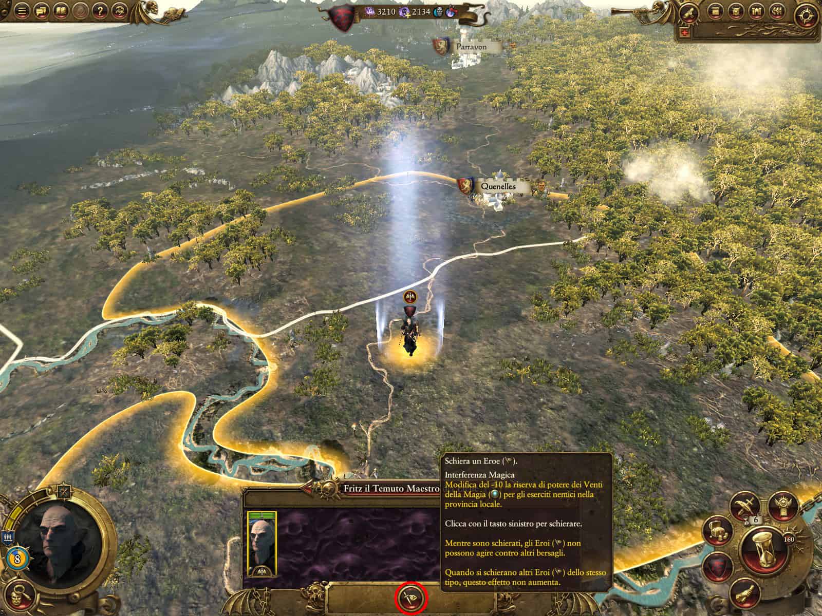 I punti di movimento dell’esercito disponibili per il turno in corso sono indicati dal quarto di arco verde sulla sinistra del ritratto del Lord dell’esercito (ogni tacca segnala un 25% del totale). Anche solo selezionando l’esercito vedrete comparire sulla mappa di campagna un’area gialla attorno a lui, che rappresenta la distanza massima che esso può percorrere nel turno in corso. Se anziché cliccare tenete premuto il tasto destro in un punto della mappa, avrete un’anteprima del percorso che l’esercito seguirà e di quanti punti spostamento spenderà per raggiungere la destinazione; lasciando il tasto destro ordinerete il movimento, mentre premendo il tasto sinistro lo annullerete.