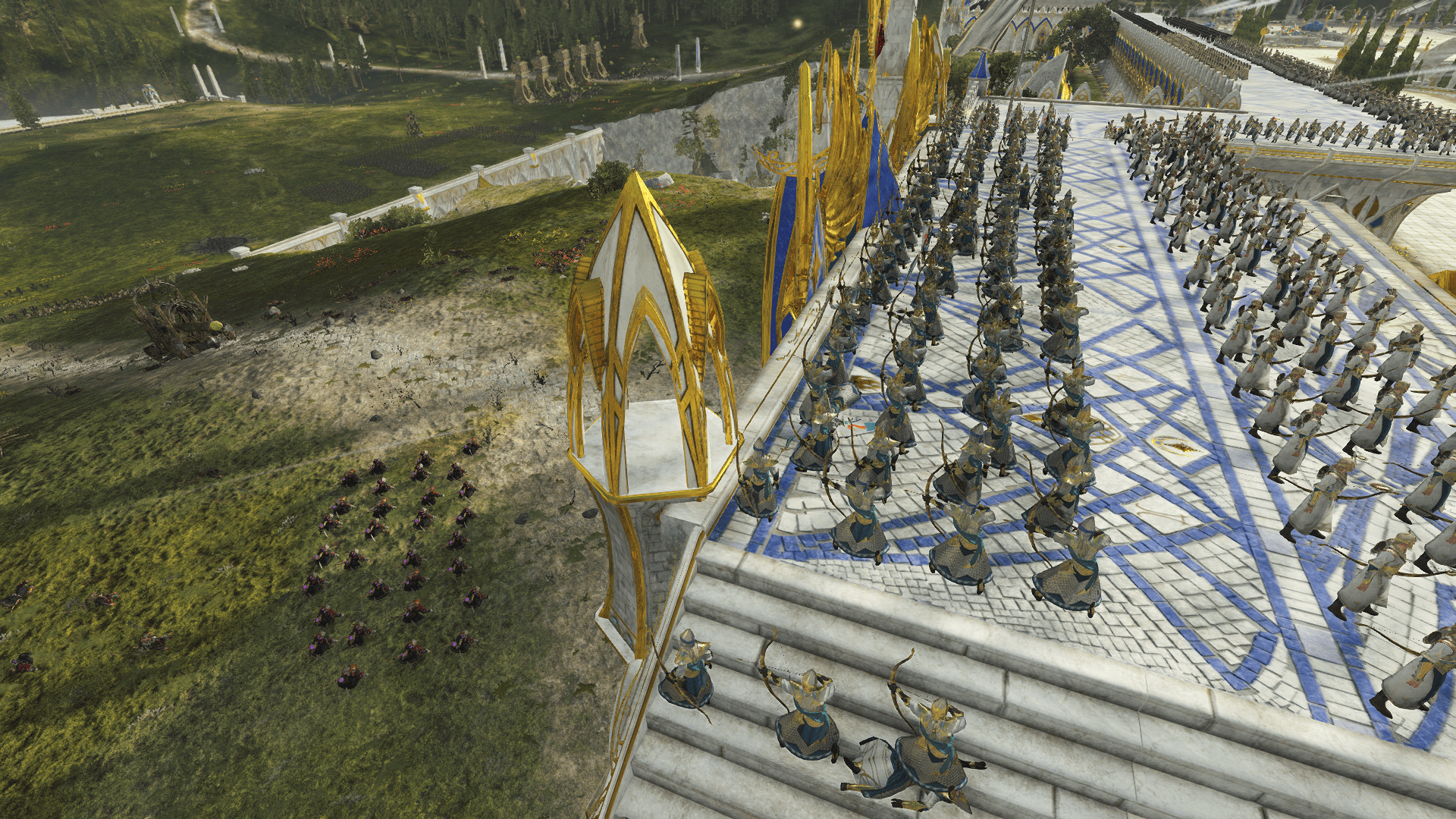 Ogni unità di Alti Elfi (non le loro creature, e fatta eccezione per i carri) ottiene un ingente bonus alle abilità di attacco e difesa corpo a corpo fino a che la loro salute è superiore al 50%. Le unità di élite hanno un’abilità simile che offre bonus ancora più grandi alle stesse condizioni. - Regole speciali di fazione: