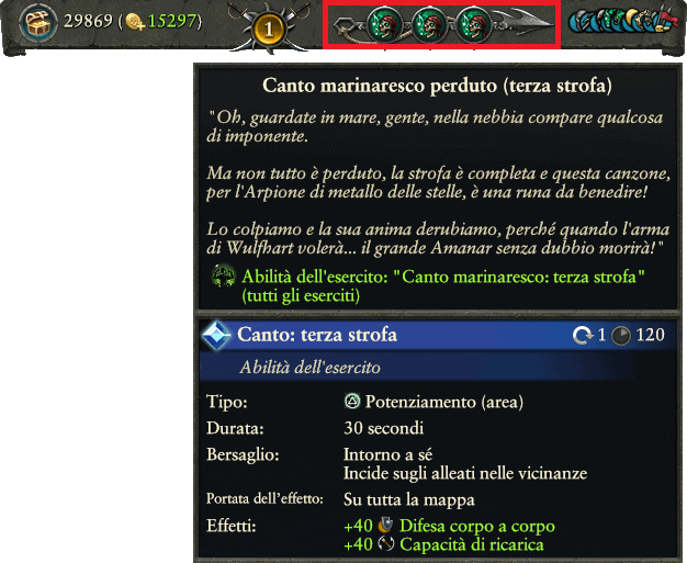 Ogni custode sconfitto cederà una delle tre terribili strofe del canto marinaresco, che sbloccheranno una magia da esercito per tutta la fazione, la quale apporterà bonus in difesa corpo a corpo e capacità di ricarica. Le strofe ottenute sono visibili in un apposito pannello presente nell’interfaccia della campagna.