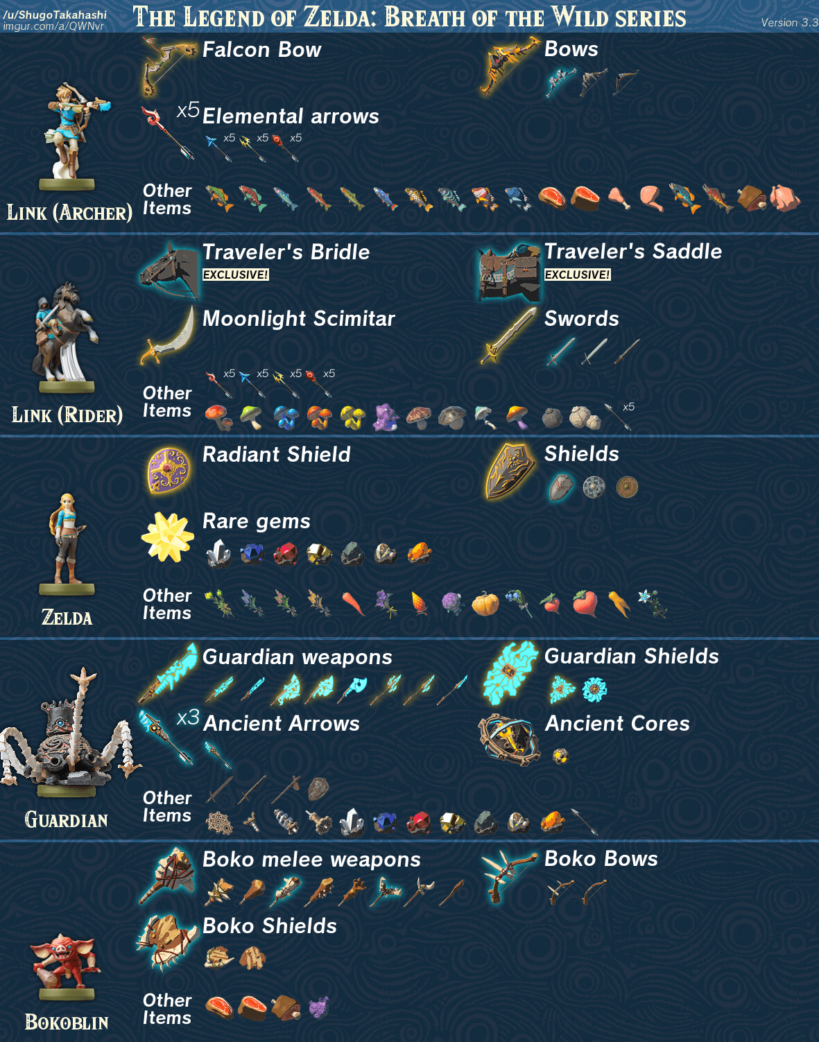 - spadone da cavaliere, spadone da soldato, spada da viaggiatore, scudo da cavaliere, scudo da soldato, scudo da viaggiatore, frecce elementali e rupie