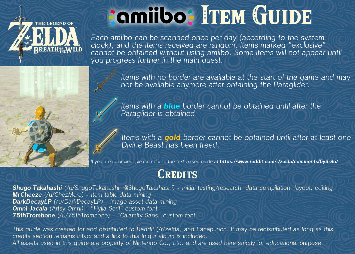 Prima di iniziare, vogliamo informarvi del fatto che alcuni contenuti extra, pur non essendo legati direttamente alla trama di Breath of the Wild, possono costituire spoiler. Procedete con attenzione. Inoltre, parleremo di alcuni amiibo non ancora annunciati, ma la cui esistenza è suggerita dalla presenza di dati specifici nel codice del gioco.