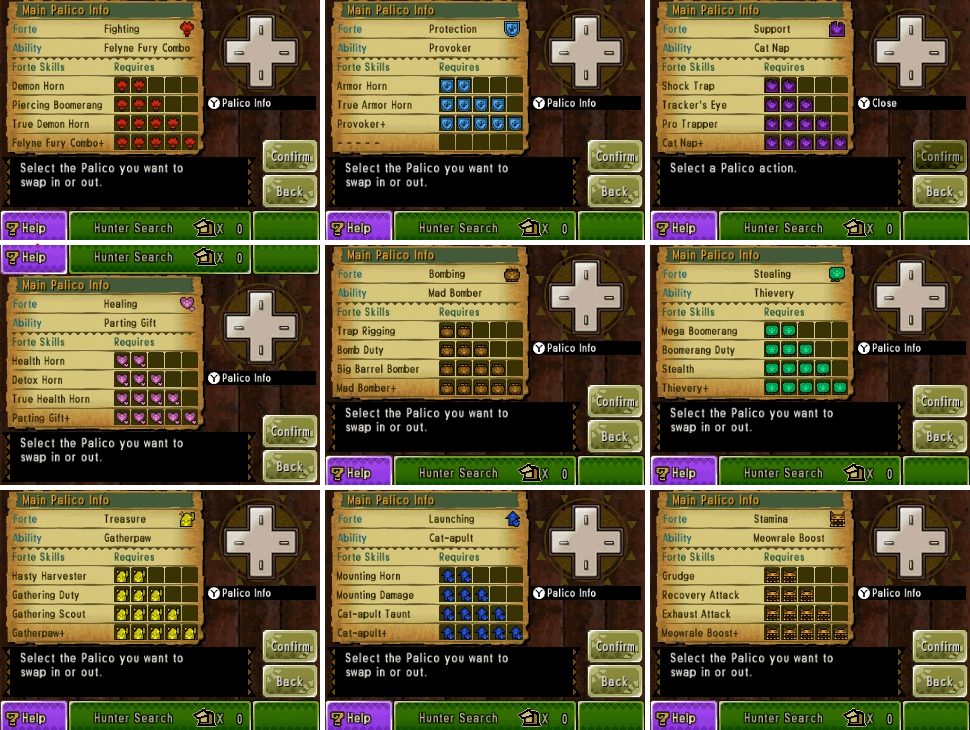 I Felyne che incontreremo nelle zone di caccia avranno abilità e Classi più o meno casuali, ma consultando le tabelle qui sotto riuscirete a prevedere almeno in parte queste caratteristiche.