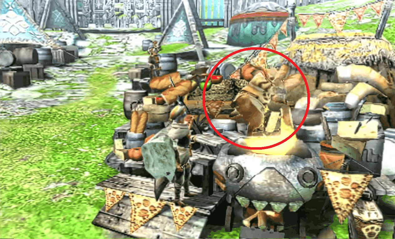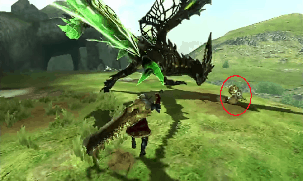 - Hmmm… che quel verde sulla corazza sia melma? Nel cerchio, un compagno Felyne.