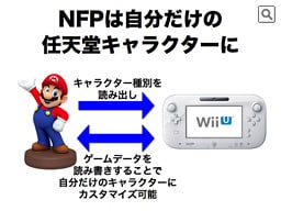 L’utilizzo di questa tecnologia si espliciterà in concreto nella vendita di varie statuine/action-figure/modellini, le quali possono comunicare con la nostra console casalinga Wii U grazie alla tecnologia NFC (Near Field Communication) integrata nel paddone: lo scambio di dati permette a chi possiede una determinata statuina (prendiamo ad esempio Mario) di far apparire il personaggio nel gioco, oltre che di personalizzarlo/exparlo per poi utilizzare il personaggio stesso (la copia fisica!) come una sorta di memory card ambulante.