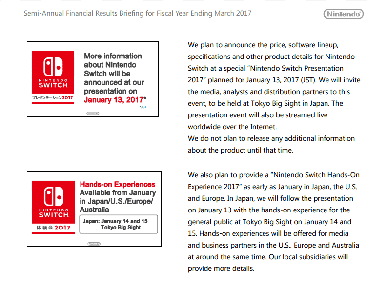 We plan to announce the price, software lineup, specifications and other product details for Nintendo Switch at a special “Nintendo Switch Presentation 2017” planned for January 13, 2017 (JST). We will invite the media, analysts and distribution partners to this event, to be held at Tokyo Big Sight in Japan. The presentation event will also be streamed live worldwide over the Internet. We do not plan to release any additional information about the product until that time.