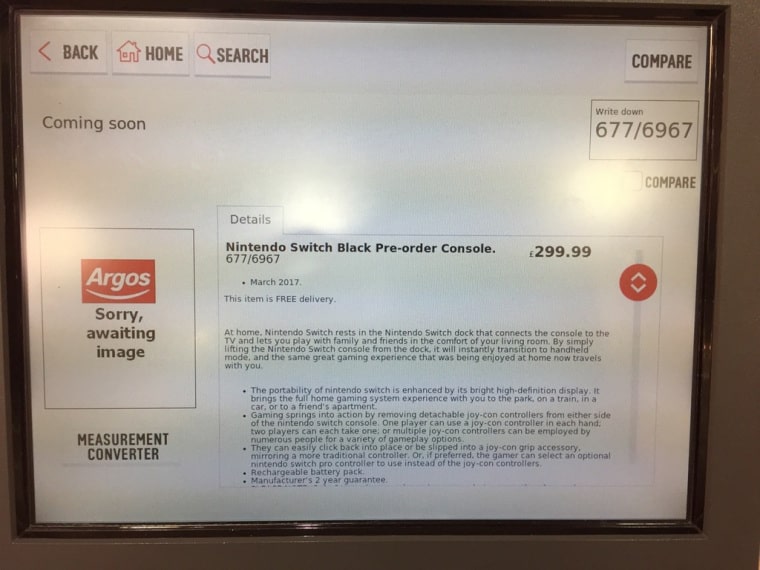 Un rivenditore inglese, Argos, ha da poco mostrato un possibile prezzo per la nuova ammiraglia Nintendo. Come potete vedere nell’immagine qui sopra, il prezzo indicato è di £299.99. Non è dato sapere se questo sarà il prezzo definitivo (e il sito fa notare che potrebbe cambiare), ma è certemente interessante vedere un rivenditore esporsi su questo prezzo.