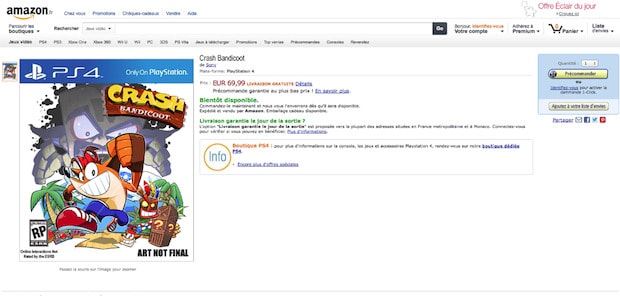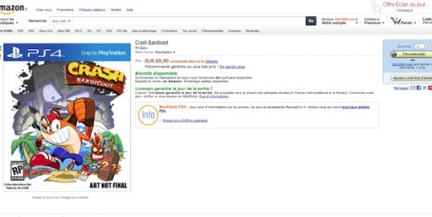 I rumors riguardanti questa vicenda sono poi stati ulteriormente alimentati da Amazon.fr, che ha inserito in catalogo un nuovo Crash Bandicoot per PS4, con tanto di prezzo (€ 69,99) e copertina provvisoria. Ovviamente, il prodotto è stato subito rimosso dal listino, ma per fortuna ci è rimasto uno screenshot di Gamepur. Eccolo qui: