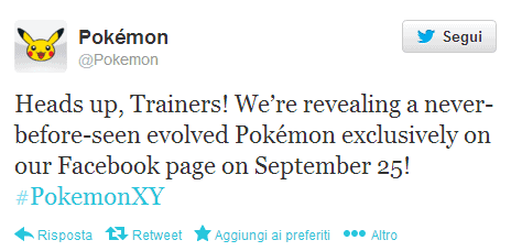 È vero che ormai manca molto poco al lancio (per la prima volta in contemporanea in tutto il mondo) di Pokémon X e Y e che le evoluzioni finali degli starter non sono ancora state svelate, ma anche se speriamo vivamente che vengano presto annunciate, difficilmente sarà questa l’occasione, visto che stando al tweet verrà annunciato un solo Pokémon.