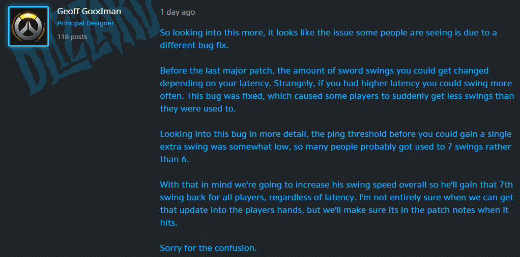 Nelle ultime ore, però, è arrivato un annuncio sul forum ufficiale di Overwatch, in cui il principal designer Geoff Goodman ha dichiarato che prossimamente arriverà un aggiornamento che bufferà la ultra di Genji per riportare nuovamente a sette il numero massimo di fendenti che potranno essere messi a segno, ma questa volta per tutti, indipendentemente dalla latenza.