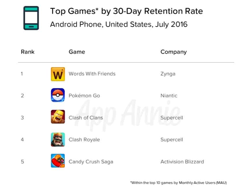 In aggiunta, il videogame sviluppato da Niantic sta dimostrando di essere un software con gli artigli. Sta infatti difendendo la sua posizione nella classifica del retention rate (non mi soffermo qui su cosa sia, ma potete trovarne qui una buona spiegazione se masticate l’inglese). Dopo due mesi dal lancio i mostriciattoli tascabili sono dietro solo a Word With Friends (mediamente un’app ha un ciclo vitale di 3 mesi).