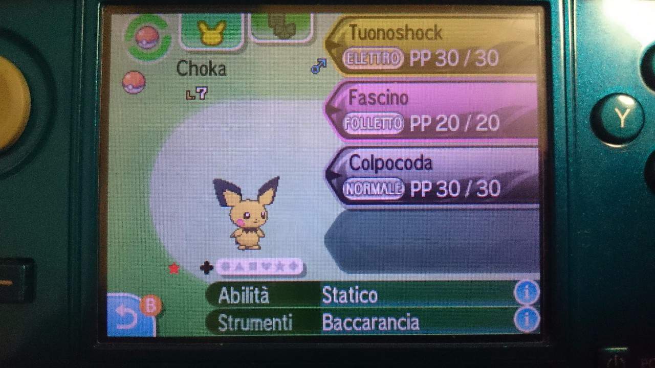 - Eevee 1: maschio, Abilità Nascosta, Natura Birbona, IV 5/10/31/31/31/0 (in rosso l’IV random, in verde e blu quelli ereditati dai rispettivi genitori), non Shiny;