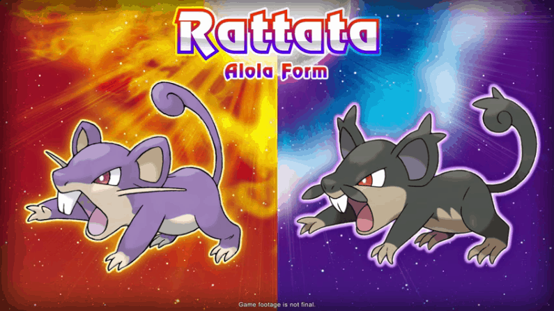 Rattata è il nuovo Pokémon che avrà una Forma Alola nei prossimi due capitoli di Pokémon. Shibata si è perfino divertito durante la Direct europea, spiegandoci come Rattata si sia evoluto. A quanto pare, dato il suo alto numero in passato, numerosi Yungoos sarebbero stati liberati per decimarne la presenza. Rattata ha dunque dovuto invertire i propri ritmi di sonno e veglia per sopravvivere, diventando un Pokémon Buio/Normale.