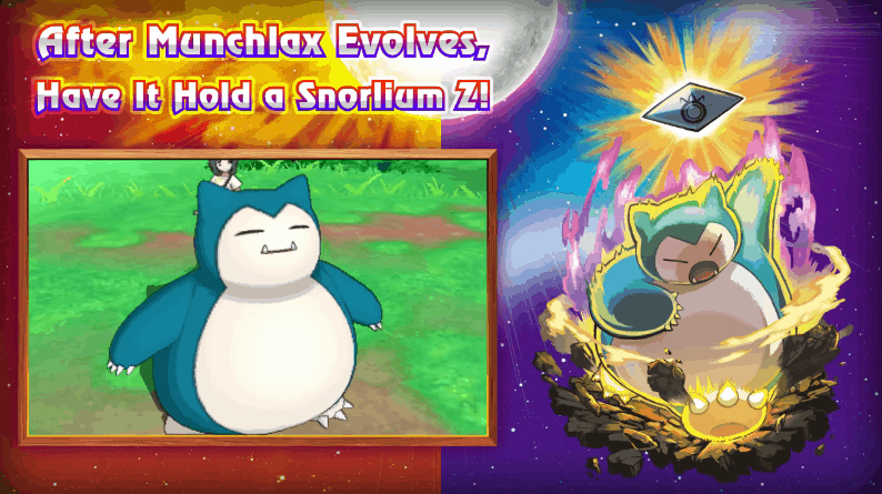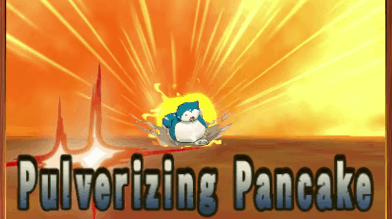 Munchlax sarà distribuito al lancio di Pokémon Sole e Luna, per tutti coloro che acquistano una copia fino al 11 gennaio 2017. Quello che ci interessa però è che a quanto pare singoli Pokémon potranno avere mosse Z dedicate. Nel caso di Munchlax, potremo far usare la mossa “Ora faccio sul serio” (“Pulverizing Pancake”) al paffuto Pokémon Normale. Ovviamente la mossa richiederà il giusto Cristallo Z per essere usata, in questo caso lo “Snorlium Z” (“Snorlite Z”?). Queste mosse (ne avrà una anche Raichu) avranno anche animazioni dedicate.