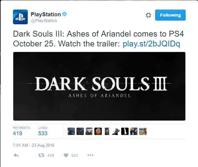 From Software aveva programmato pubblicamente l’annuncio del primo DLC di Dark Souls 3 per il 24 agosto, ovvero domani, ma sembra che a qualcuno presso l’account Twitter di Sony sia scappato un click con un giorno di anticipo. Ora il tweet in questione è stato reso privato, ma diversa gente ha fatto in tempo a salvarlo: