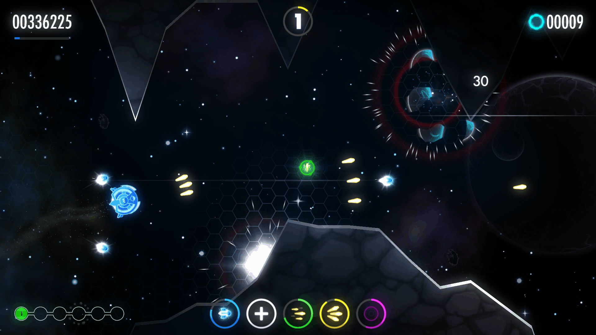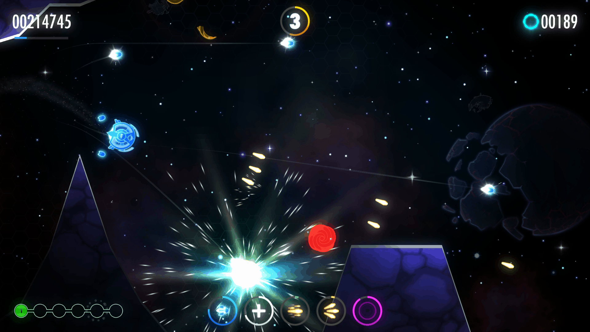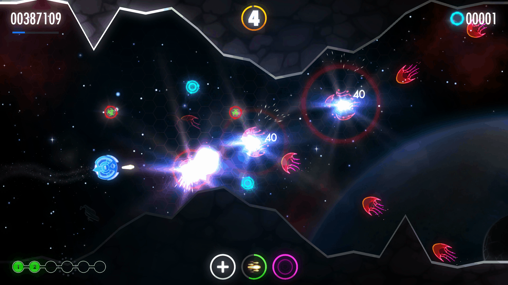 Come da tradizione nel genere, lungo il percorso è possibile raccogliere diversi potenziamenti che vi permetteranno di incrementare la cadenza e il raggio di fuoco, oppure di ripristinare la salute della navetta. Non tutto è oro quel che luccica, però: se raccoglierete ciecamente tutto quello che vi si para davanti, andrete incontro a dei virus che inibiranno il fuoco automatico della navicella per diversi secondi. L’apparizione di questi virus in maniera totalmente randomica insieme a tutti gli altri power-up innalza di un ulteriore livello la richiesta di un minimo di strategia da parte del giocatore.