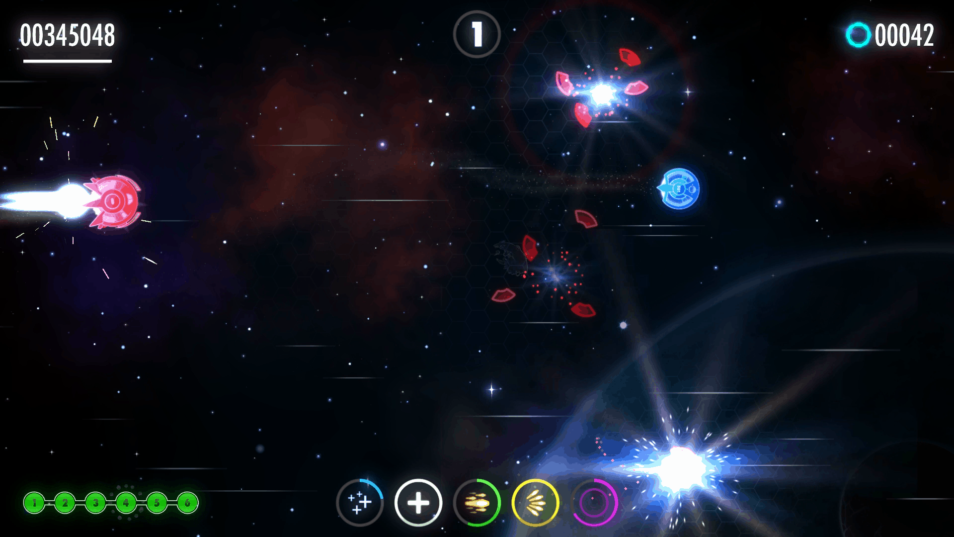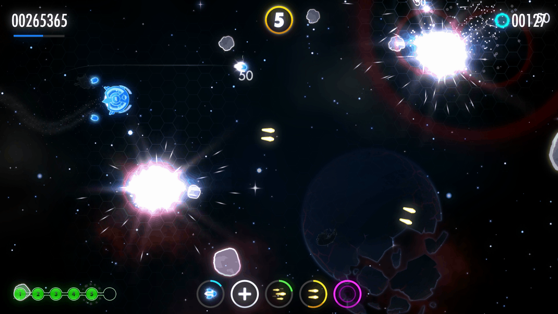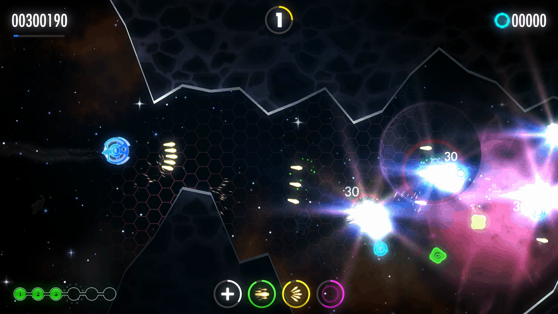 Come da tradizione nel genere, lungo il percorso è possibile raccogliere diversi potenziamenti che vi permetteranno di incrementare la cadenza e il raggio di fuoco, oppure di ripristinare la salute della navetta. Non tutto è oro quel che luccica, però: se raccoglierete ciecamente tutto quello che vi si para davanti, andrete incontro a dei virus che inibiranno il fuoco automatico della navicella per diversi secondi. L’apparizione di questi virus in maniera totalmente randomica insieme a tutti gli altri power-up innalza di un ulteriore livello la richiesta di un minimo di strategia da parte del giocatore.