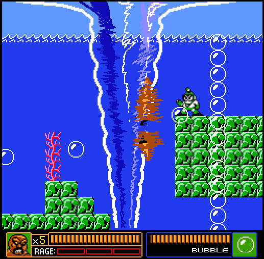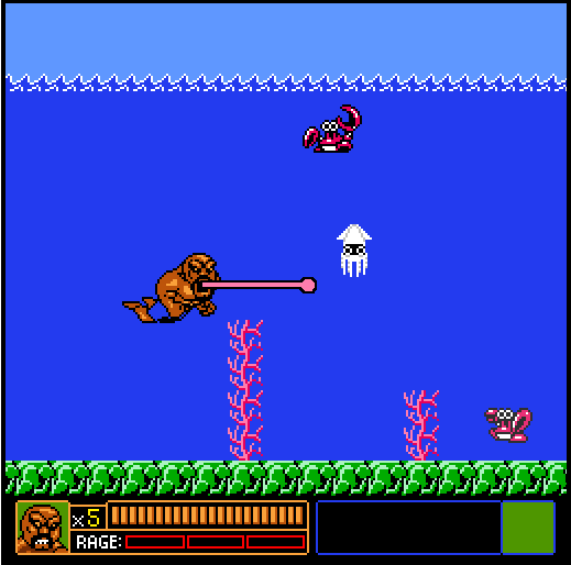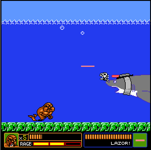 A questo punto forse si comincia davvero a capire che Abobo non è solo un tributo che occasionalmente fa anche citazioni oscure, ma è anche un titolo… completamente fuori di testa! Vi basti ad esempio sapere che potrete utilizzare dei semplici fanciulli (presi da River City Ransom) sia come mezzo per recuperare la vostra energia vitale (mangiandone la testa), sia come arma di distruzione di massa (gettandone via le spoglie). Insomma, un Parodius… un pochino più violento, giusto un tantinello. E proseguendo, le situazioni al limite della sanità mentale aumentano sempre più, come il livello subacqueo di Super Mario Bros. presidiato da niente di meno che… Lo Squalo. E ci fermiamo qui, per non rovinarvi la sorpresa.