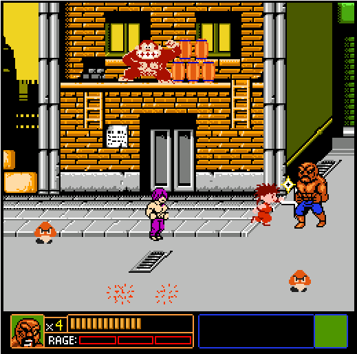 E proprio da quest’ultimo inizia l’avventura di Abobo. C’è da dire che gli sviluppatori si sono davvero divertiti a giocare con i ricordi di chi, al tempo, provò questa gemma. Quand’ecco che all’improvviso… iniziano ad apparire su schermo nemici che provengono da titoli completamente diversi, come dei Goomba (!) da calciare via o un Kid Niki da prendere a randellate.