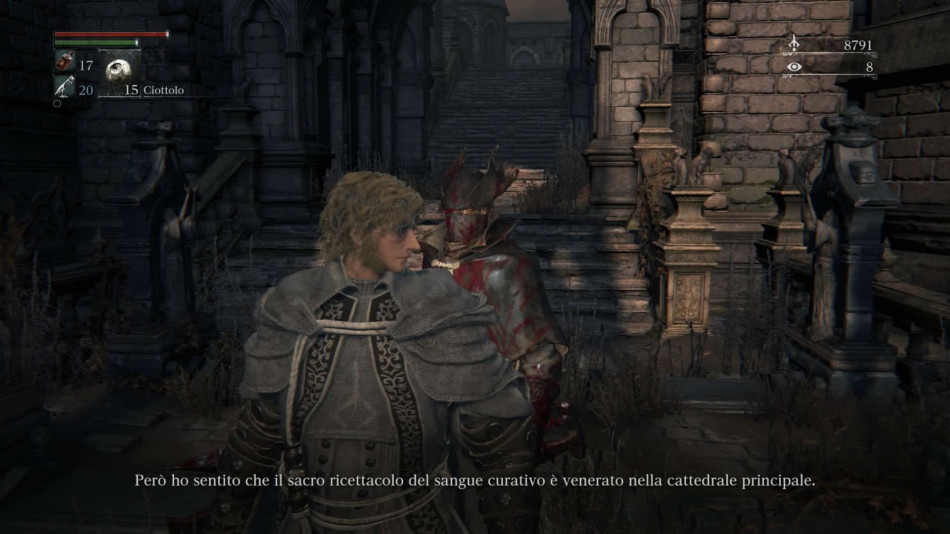 Il personaggio, ovviamente, sale a sua volta di livello spendendo Echi di sangue (rimpiazzo delle Anime), con un sistema praticamente identico a quello di Dark e Demon’s Souls: ad ogni livello la difesa fisica aumenta in automatico, e in più si può decidere se far crescere anche salute, stamina (e resistenze ai veleni) o uno di quattro attributi (forza, abilità, tinta del sangue e arcano) che permettono di usare o aumentano l’efficacia di armi e oggetti speciali.