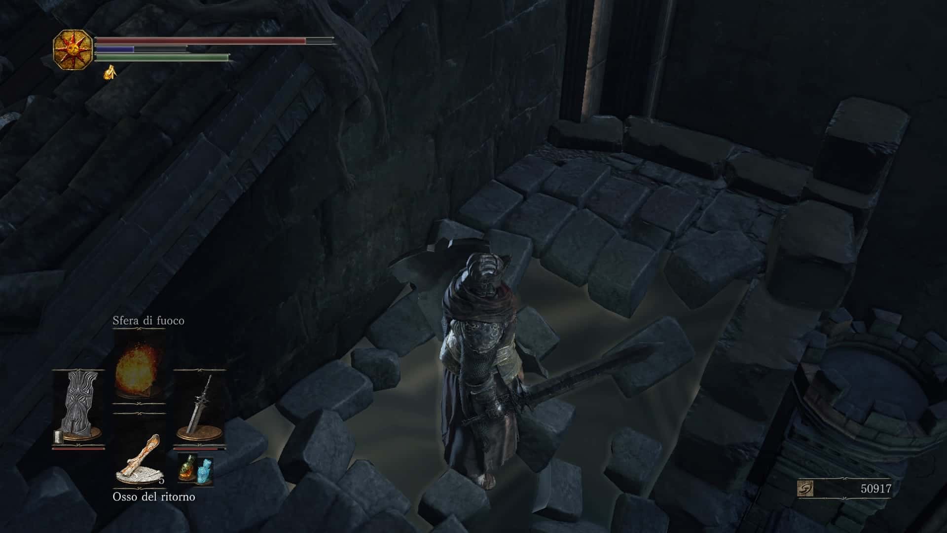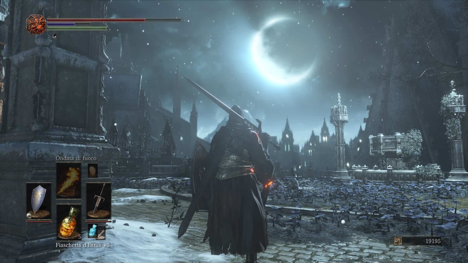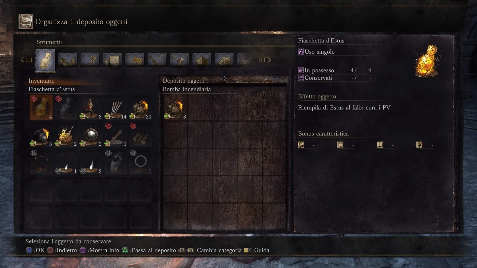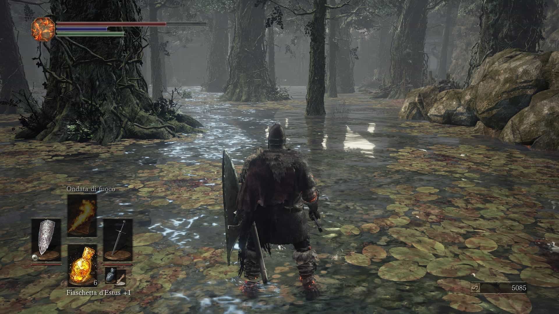 L’inventario è strutturato come quello di Bloodborne, con tanto di magazzino in cui gli oggetti oltre una certa eccedenza vengono trasportati in automatico. Dato che qui praticamente nessun consumabile generico ripristina salute, mana o altro potrebbe sembrare una scelta superflua, ma visto che anche il processo inverso è vero – cioè, se si consumano oggetti nell’inventario le scorte del magazzino vengono automaticamente riconsegnate al giocatore appena ci si ferma ad un falò – in definitiva non produce neanche alcun danno.