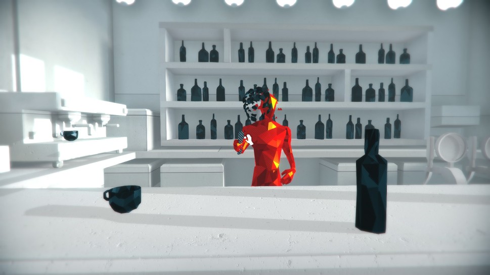 Ed è proprio questo il concept tanto semplice quanto originale che sta alla base di SUPERHOT: siamo noi i padroni del tempo, restando immobili il tempo scorrerà molto lentamente, dandoci la sensazione che si sia fermato, ma basta fare un singolo passo o anche solo spostare la visuale per velocizzarlo fino a renderlo addirittura più veloce del normale. Il primo impatto con questo tipo di meccaniche è onestamente spiazzante. Dimentichiamoci ogni precedente esperienza FPS, in SUPERHOT non sarà tanto la mira a salvarci quanto la nostra tattica, la nostra intelligenza. Per sopravvivere negli angusti livelli che ci verranno proposti in sequenza dovremo pianificare ogni singola mossa, essere consci di ciò che ci circonda, delle provenienza dei minacciosi “red dudes”, gli uomini rossi che per qualche ragione ignota ci vogliono morti. Nonostante il gioco tenti di introdurci allo stile di gioco previsto dagli sviluppatori con una progressione abbastanza ben calibrata, è inutile negare che i primi livelli potrebbero risultare abbastanza frustranti: basta infatti un solo colpo per mandarci a tappeto. . Nel glaciale bianco che domina gli scenari riconosceremo subito gli oggetti che potremo utilizzare come armi dal colore nero che contraddistingue i loro modelli: a differenza del prototipo del 2013, infatti, avremo a disposizione non solo la pistola e le mani nude, ma anche altri tipi di arma da fuoco come fucili automatici e a pompa, nonchè armi contundenti come katane e mazze da baseball e addirittura altri oggetti non contundenti come cornette telefoniche o tastiere di computer che, all’occorrenza, potrebbero salvarci la vita in situazioni disperate.