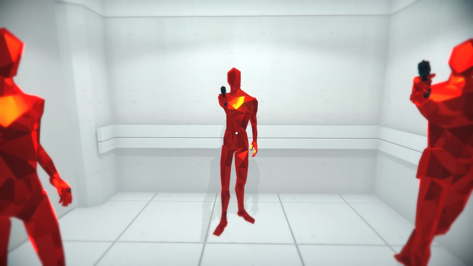 Il titolo si apre con una schermata stile MS-DOS, un menù principale vecchio stampo che, oltre a permetterci di settare le impostazioni o avviare il gioco vero e proprio nasconde molte altre chicche che vi consigliamo di esplorare. Si apre quindi una chat stilizzata nella quale un ignoto conoscente ci suggerisce di provare un nuovo titolo, sgraffignato grazie a una crack: “superhot.exe”. Avviamo l’eseguibile e ha inizio l’avventura. Ci ritroviamo in un ambiente totalmente asettico, stilizzato, il bianco domina lo schermo, se non fosse per quella figura poligonale che ricorda molto un essere umano, rossa come il sangue, la testa che si scompone in mille pezzi, come un vetro distrutto da un proiettile: gli abbiamo sparato. Non c’è tempo per le spiegazioni, tutorial o quant’altro, la nostra mente ha già compreso tutto: i rossi sono i cattivi, per uscirne vivi dobbiamo eliminarli. Poi un flash, e un altro flash, scritte che compaiono sullo schermo per pochi istanti ma quanto basta per comprenderle: “Time moves…when you move”.