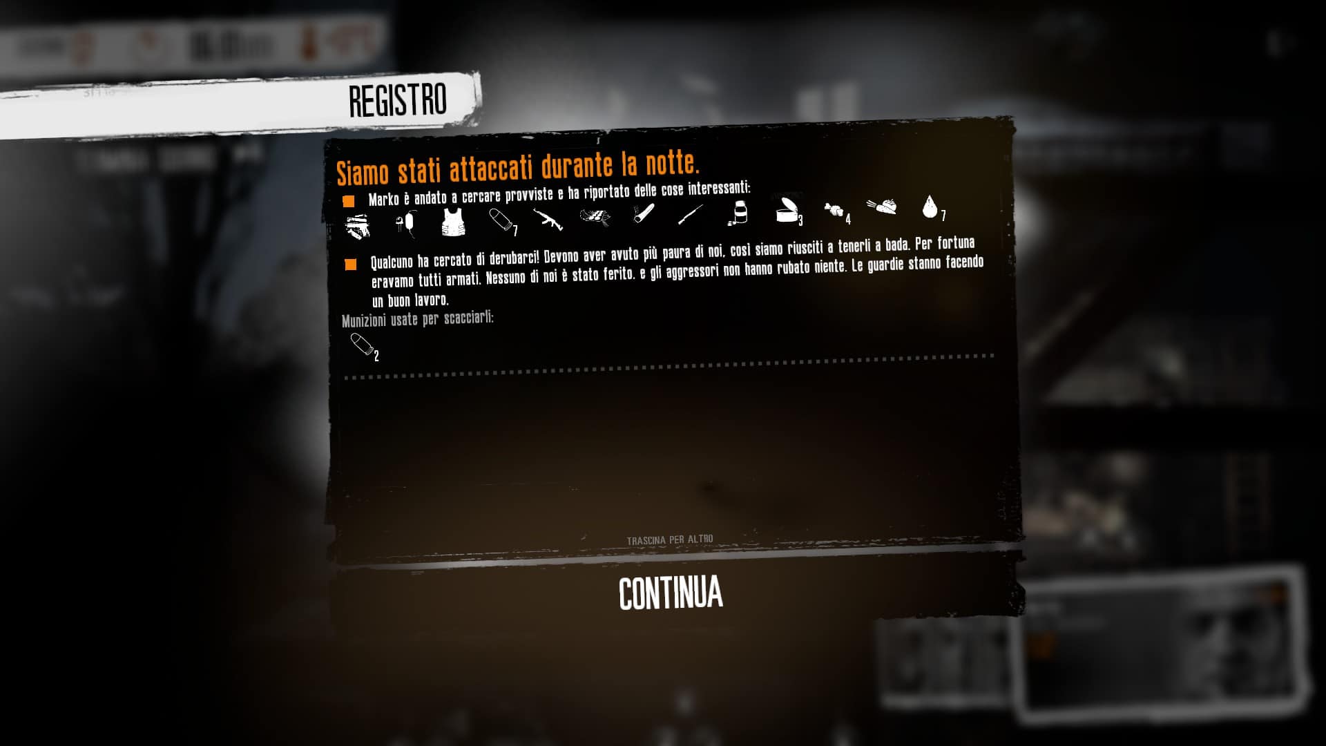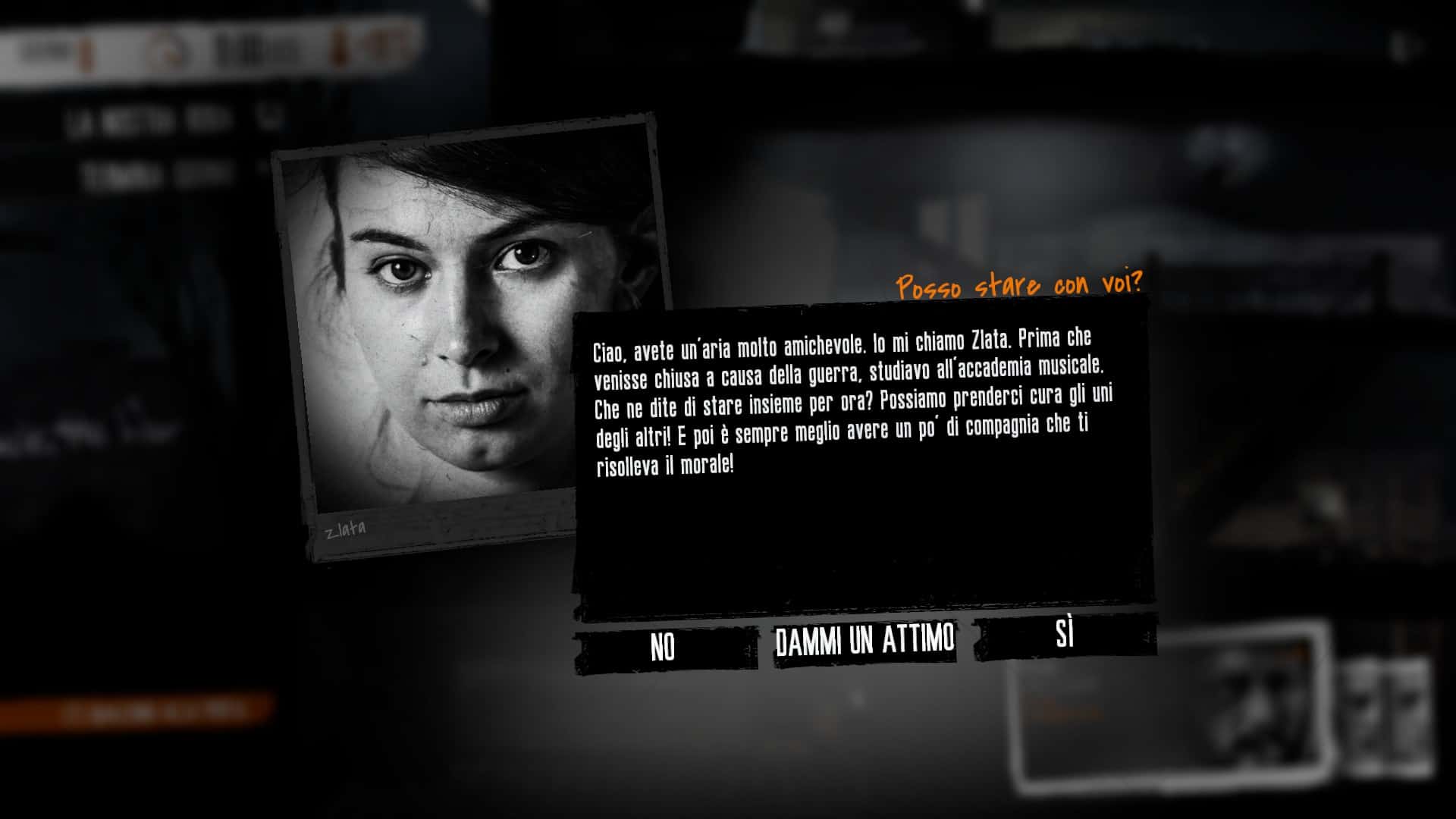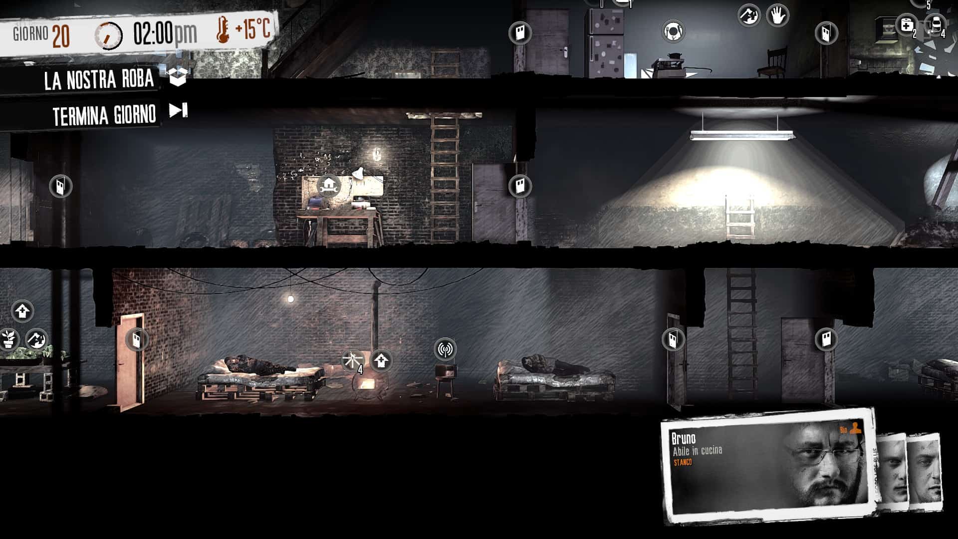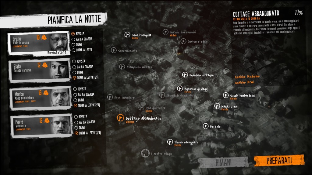 Durante la notte, invece,è possibile prendere il controllo di uno dei sopravvissuti, che vestirà i panni del “rovistatore“, ovvero potrà spostarsi in una delle ubicazioni presenti nella mappa di gioco alla ricerca di cibo, medicine, armi e materiale per il crafting. Durante l’esplorazione, ci si potrà imbattere anche in altri superstiti: banditi armati fino ai denti ai quali è meglio non avvicinarsi, commercianti con cui barattare merci e cibo, innocenti bisognosi d’aiuto… In queste occasioni, ci troveremo a scegliere la nostra condotta. Voi cosa fareste: preferireste far morire un caro amico ammalato, oppure rubereste le medicine ad una coppia di anziani deboli e indifesi? “Comportarsi male” (o “scegliere ciò che è necessario”, se preferite) non avrà gravi ripercussioni all’interno del gioco, ma ogni nostra azione ci verrà spietatamente rinfacciata una volta arrivati all’inevitabile game over, mettendoci di fronte agli orrori della guerra di cui siamo stati vittima ma, al tempo stesso, a cui noi stessi abbiamo contribuito, mostrando dunque cosa si può arrivare a fare, pur di sopravvivere, in situazioni critiche.