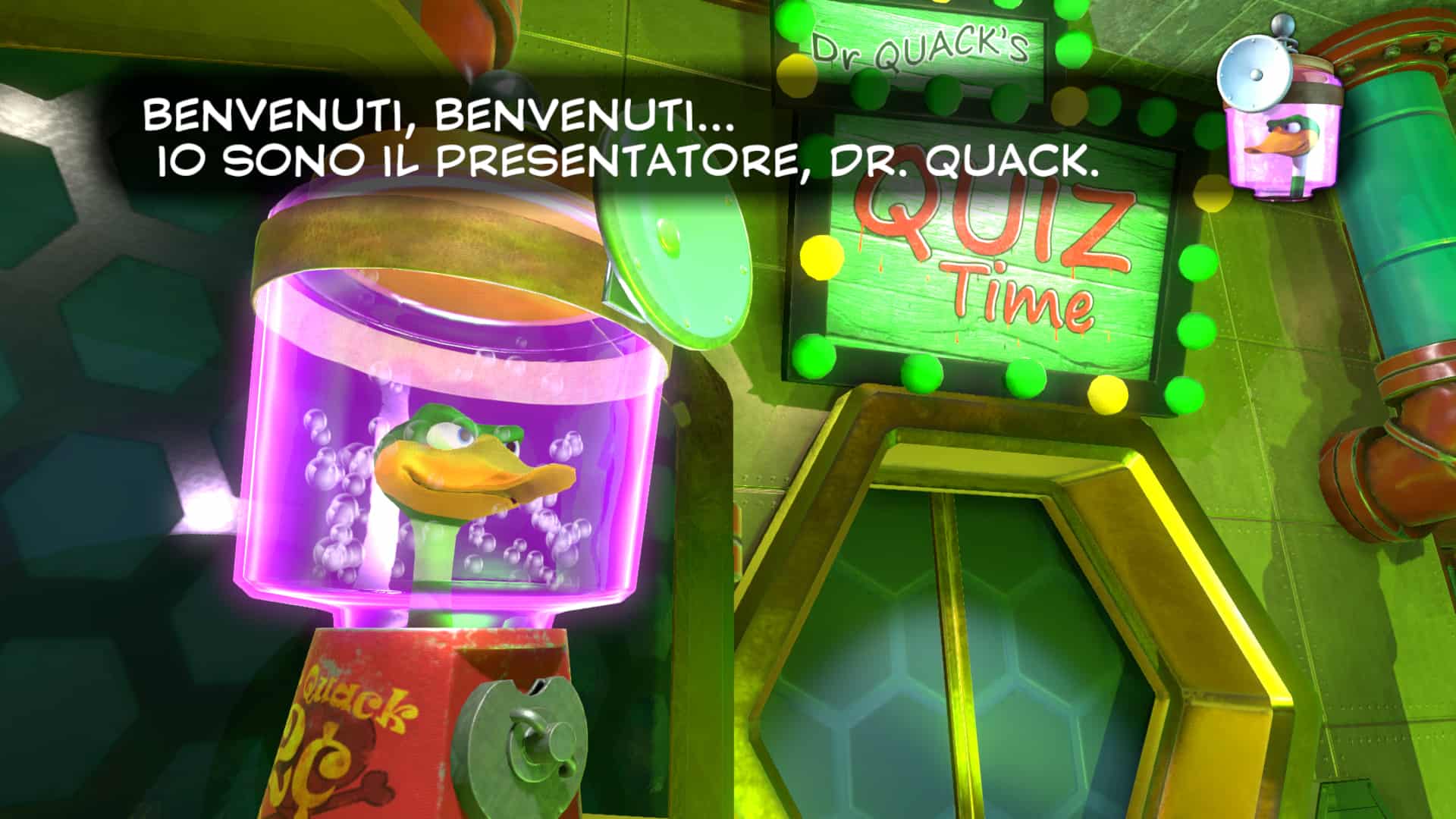 L’idea di dover ricominciare da capo a raccogliere collezionabili in un mondo che, tra l’altro, non mi ha fatto impazzire fin da subito come design, e con neanche la più pallida idea di dove iniziare, devo dire che mi ha inizialmente gettato un po’ nello sconforto. Non ha aiutato in questo caso l’immensa vastità di aree pressochè vuote e desolate, con nemici a fare più da comparsa che da pericolo da combattere. Aprendo un parentesi, ho trovato la realizzazione dei 5 livelli dannatamente altalenante sia a livello di ispirazione quanto di vero e proprio map design. Si salvano il primo e l’ultimo livello. Tornando a noi, è vero che si sbloccano nuove meccaniche come la planata di Laylee o la possibilità di assumere le caratteristiche degli oggetti ingeriti da Yooka ma, onestamente, non è abbastanza. Finito l’entusiasmo delle prime due ore si è fatta sempre più forte in me la consapevolezza che lo sviluppo, non solo come persona, ma anche dell’industria videoludica in generale,mi abbia profondamente cambiato. Siamo abituati a pretendere molto di più da un videogioco, anche se di nicchia. Non può bastare l’effetto nostalgia e una grafica “moderna” (ma non priva di difetti) a tenera a galla un platform che pecca su punti cardine fondamentali come la gestione della telecamera o il design dei livelli. Yooka-Laylee, in sostanza, eredità pregi e difetti non solo di Banjo-Kazooie, ma un po’ di tutti i platform 3D degli anni d’oro, con la sola differenza che sono passati 20 anni e, inevitabilmente, i palati dei giocatori si sono raffinati, nuovi affascinanti generi sono nati e cresciuti, l’industria videoludica in toto è maturata, proprio come noi. Proseguo dunque affrontando la nostalgia che si appollaia sulle mie spalle come Laylee, superando corse frenetiche con un carro da miniera di nome Kartos, perdendomi all’interno di un labirinto in visuale isometrica, e giungo infine al fatidico quiz (anche questo triste retaggio di B&K) su quante pagie o piume ho raccolto fin’ora, o qual era il nome di quell’NPC dalle fattezze suine incontrato nel primo livello. “Non barare guardando su Yookapedia”, mi avverte Dr.Quack, altra conferma che certe meccaniche, ad oggi, sono davvero insensate.