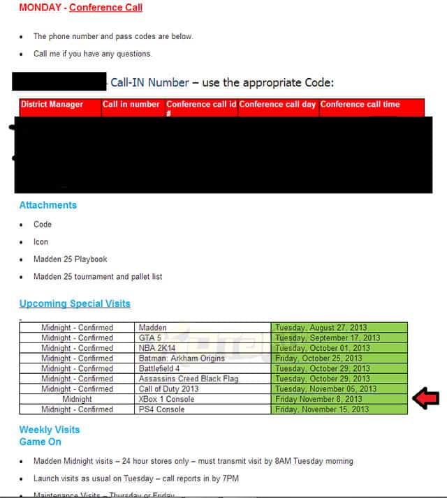 Kotaku riporta oggi una possibile data d’uscita per Xbox One, l’8 novembre. La “notizia” arriva da un anonimo lavoratore di una compagnia che si occupa di organizzare e gestire i prodotti da mettere in vendita per Walmart, che ha diffuso un piano orario realtivo ad alcuni videogiochi e console per il mese di novembre.