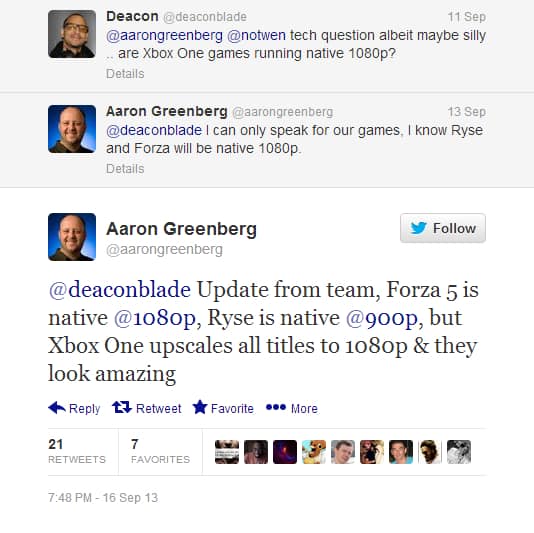Qualche giorno fa Aaron Greenberg di Microsoft aveva risposto ad una domanda rivoltagli su Twitter che chiedeva se i giochi in uscita su One saranno in 1080p dicendo che, parlando di loro titoli esclusivi, Ryse e Forza 5 avrebbero avuto una risoluzione nativa di 1080p.