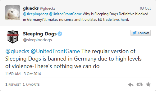 Questo non significa, come molti erroneamente lo interpretano, che è illegale possedere una copia di Sleeping Dogs in territorio tedesco, solo che è illegale distribuirlo/venderlo per canali normali, mostrarlo durante eventi pubblici o in qualsiasi caso darlo ad un minorenne (o possederlo se si è minorenni). Un maggiorenne può importarne una copia dall’estero “per uso personale” senza infrangere la legge, e credo che negozi speciali registrati come distributori di prodotti per soli adulti possano venderlo. In sostanza, è trattato come se fosse materiale pornografico.